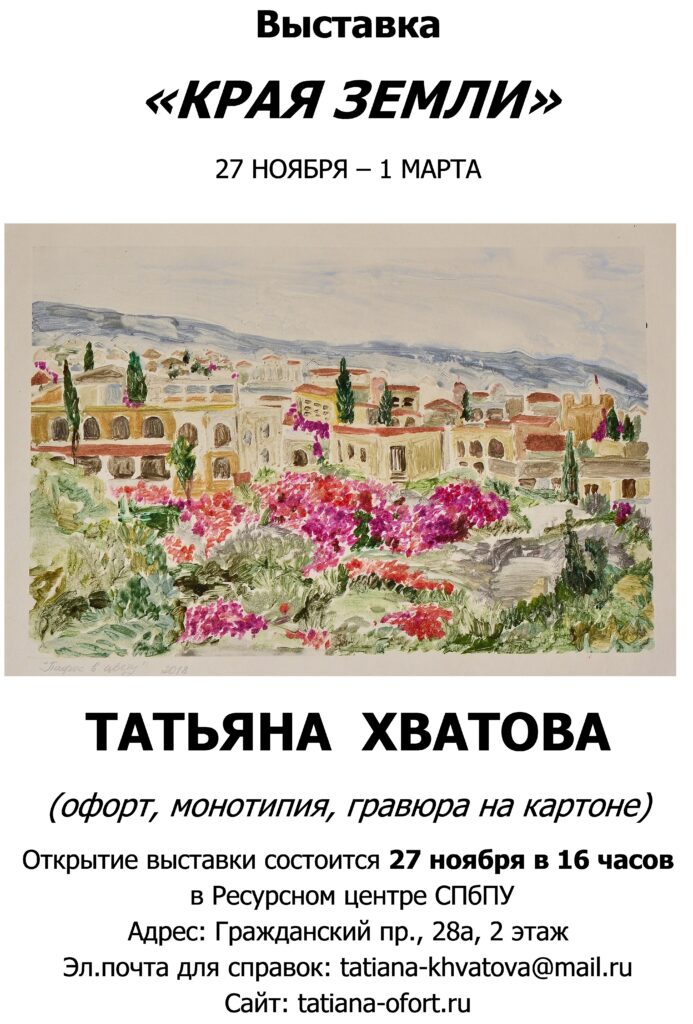 27.11.18 — 01.03.2019 — Personal exhibition «Edges of the World» in the International Resource Center of Peter the Great St.Petersburg Polytechnic University. Address: Grazhdansky Pr. 28A, 2nd floor, rooms 218 and 220.